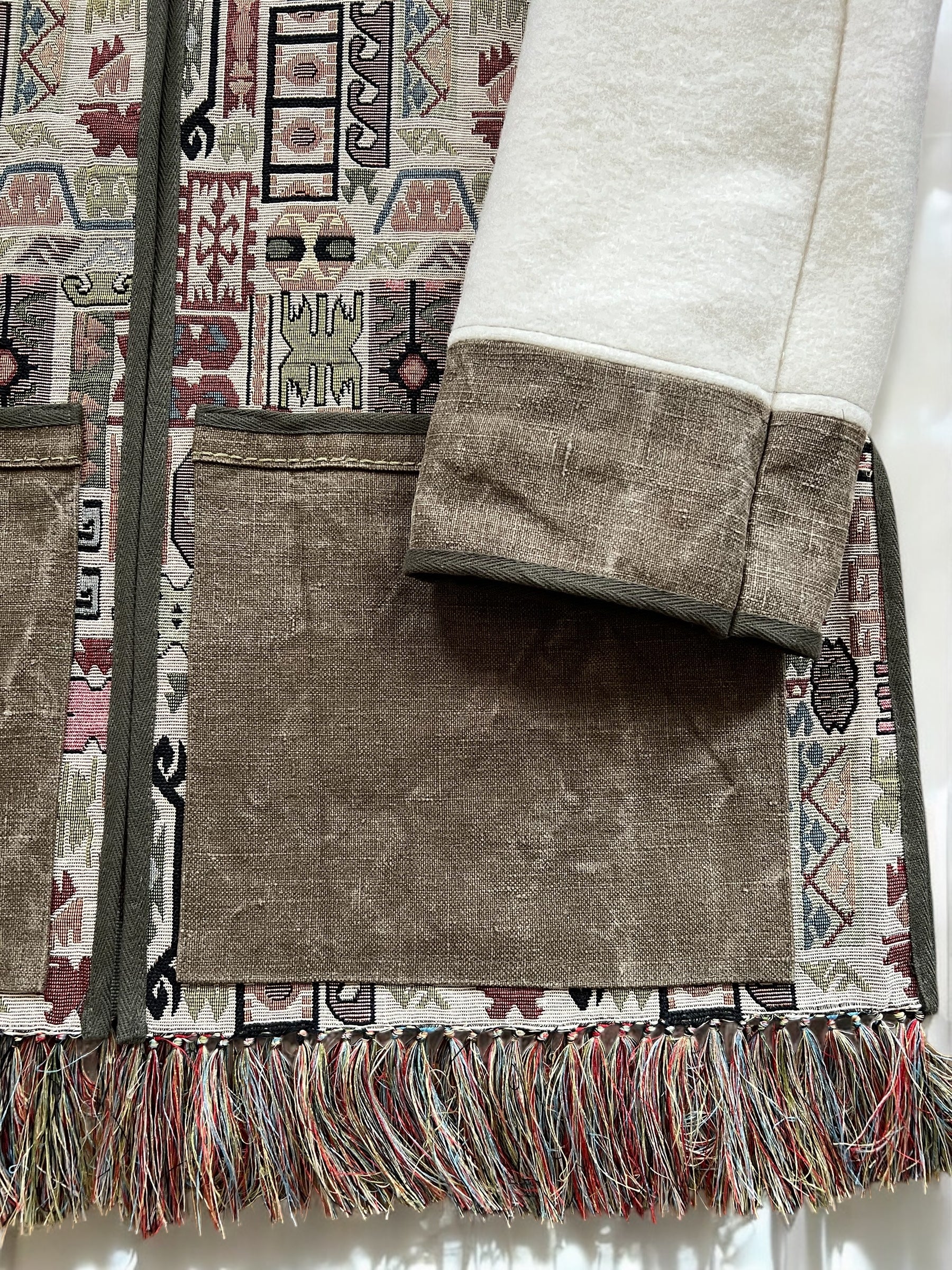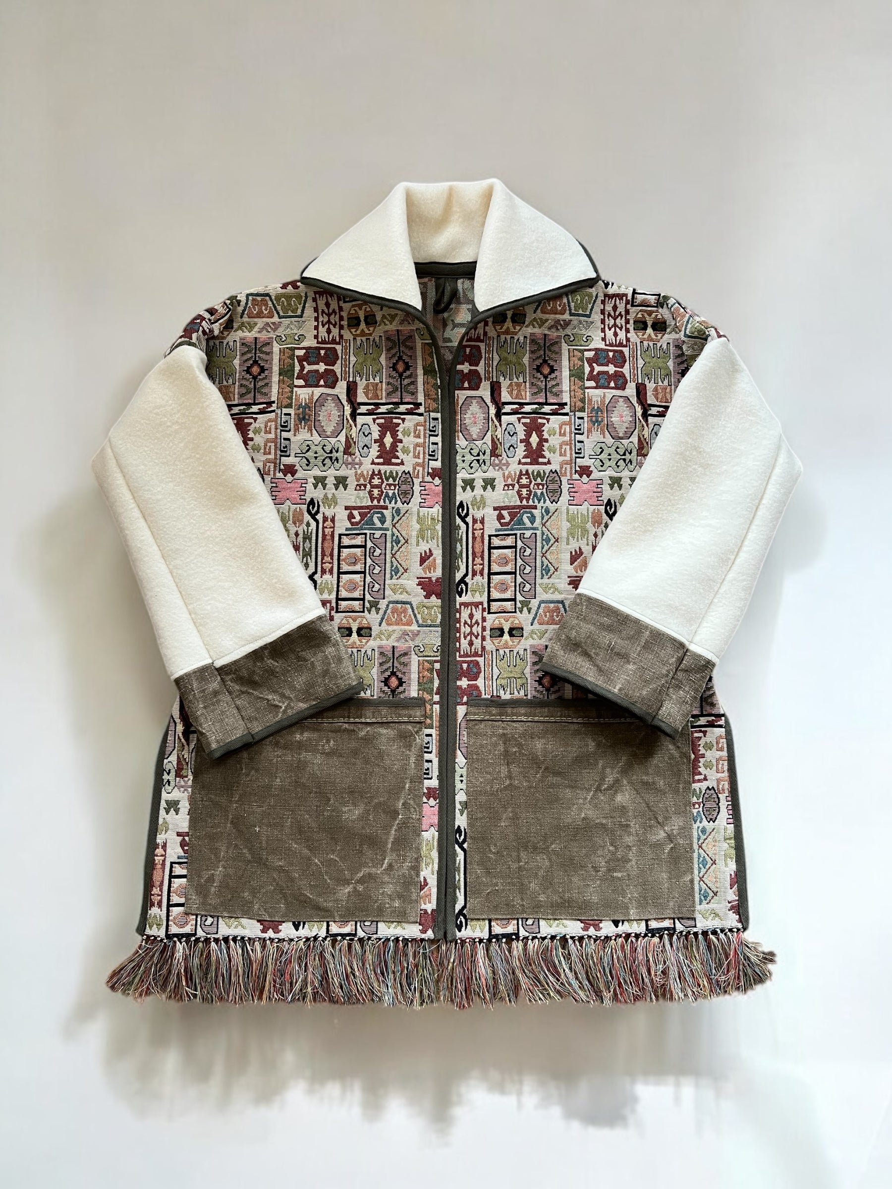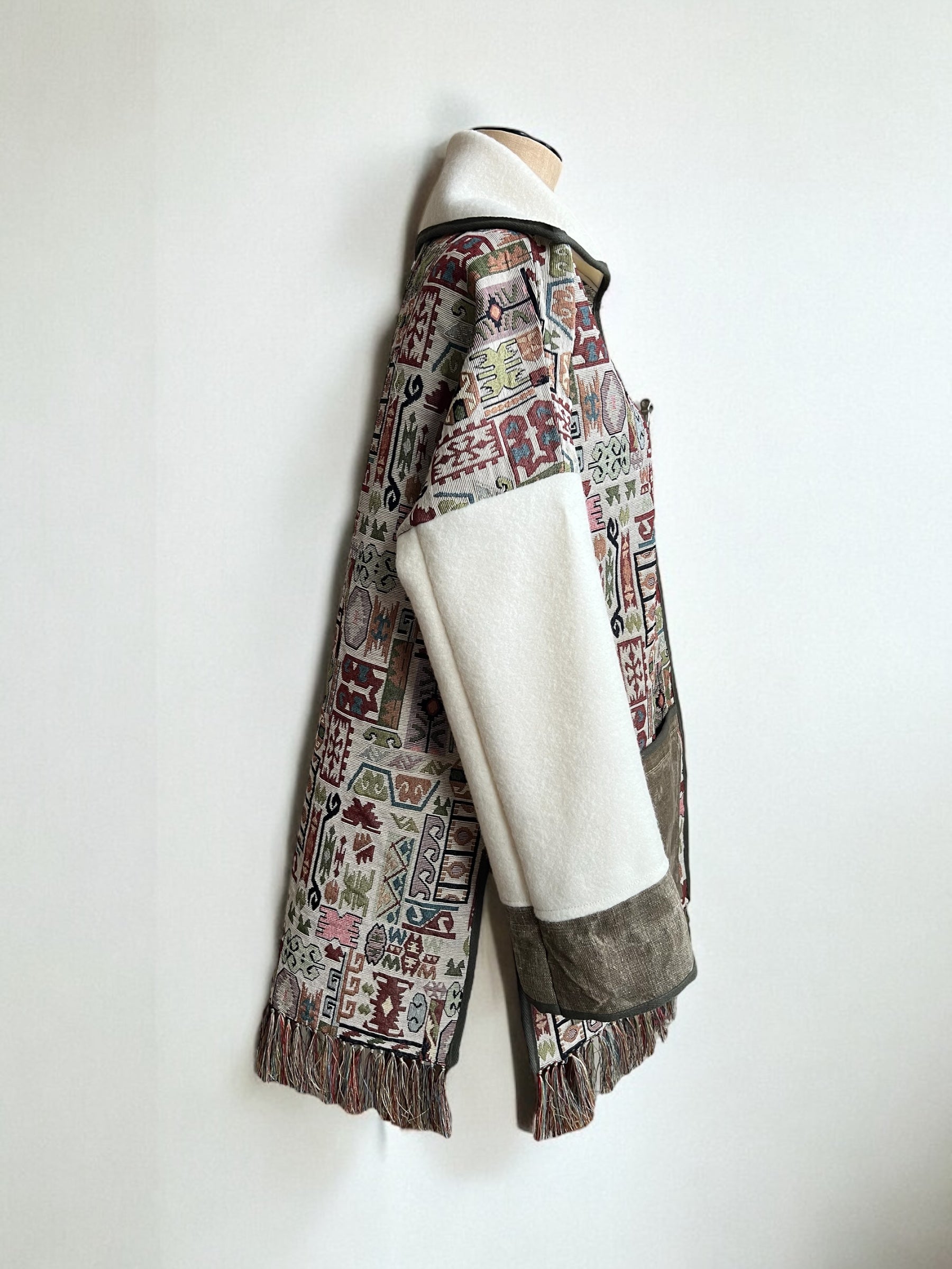 This Jacket is made with Vintage Fringed Tapestry fabric, combined with Vintage Witney Blanket for arms and collar, and Vintage Tent Canvas for pocket and cuff trim.
