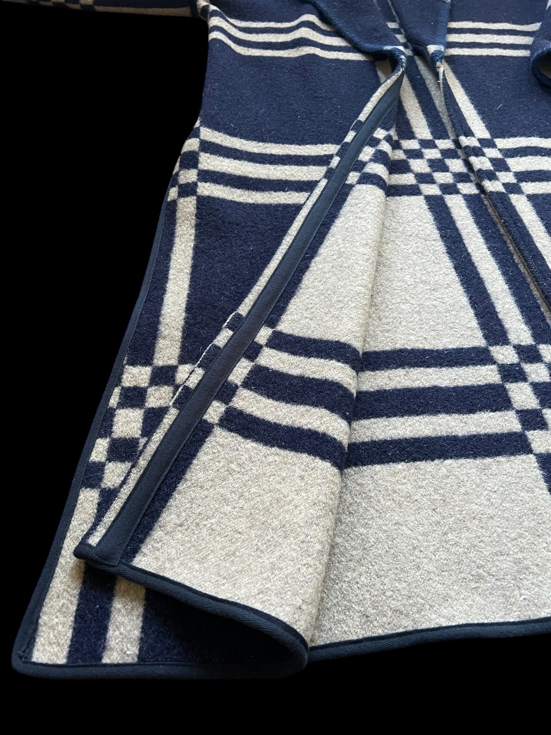 This Coat is made from a heavy weight double sided vintage wool blanket with a checked pattern in blue and oatmeal and an original blanket stitch edge.