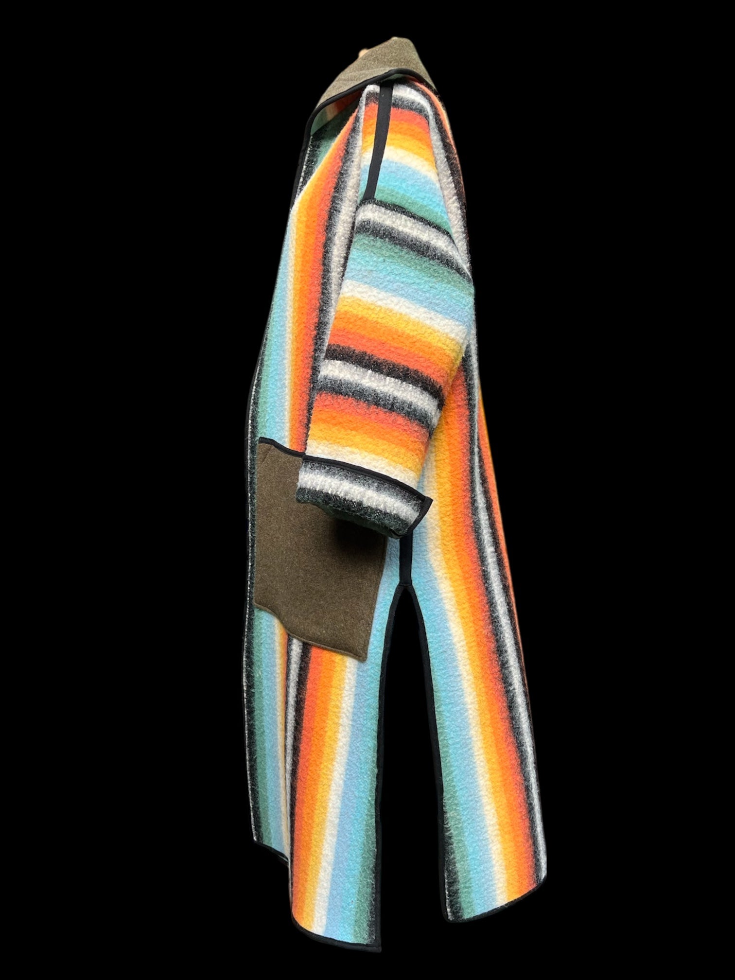 This Coat is made from a vintage double sided wool blanket, with pieces of an Italian Army Blanket in military 'drab' green for Patch Pockets and Collar.