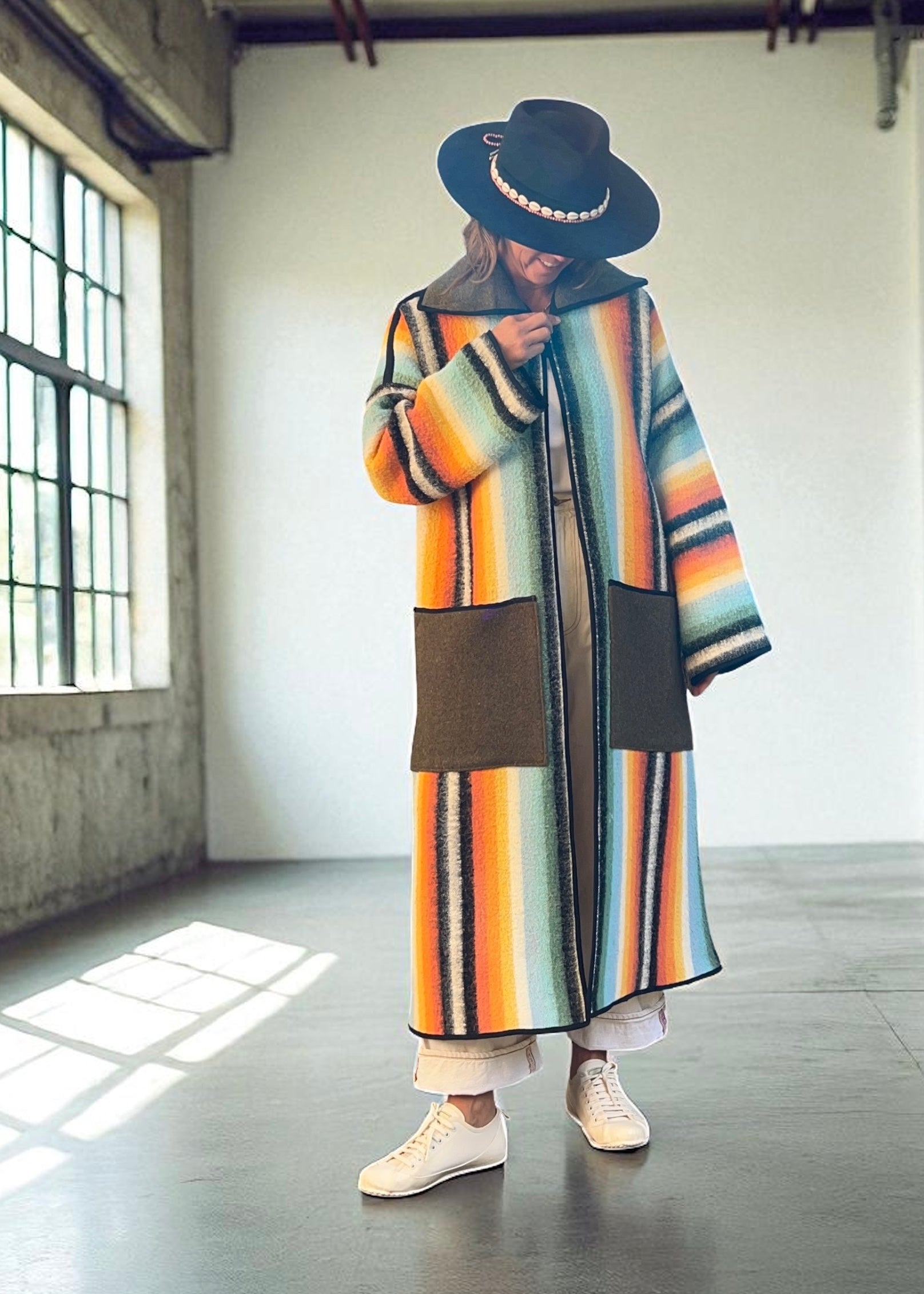 Single layer, unlined coat, that feels just like a warm blanket is wrapped around you. Completely reversible. Patch pockets are placed only on the Sunset side of the coat, while the reverse side will feature no exterior pockets.