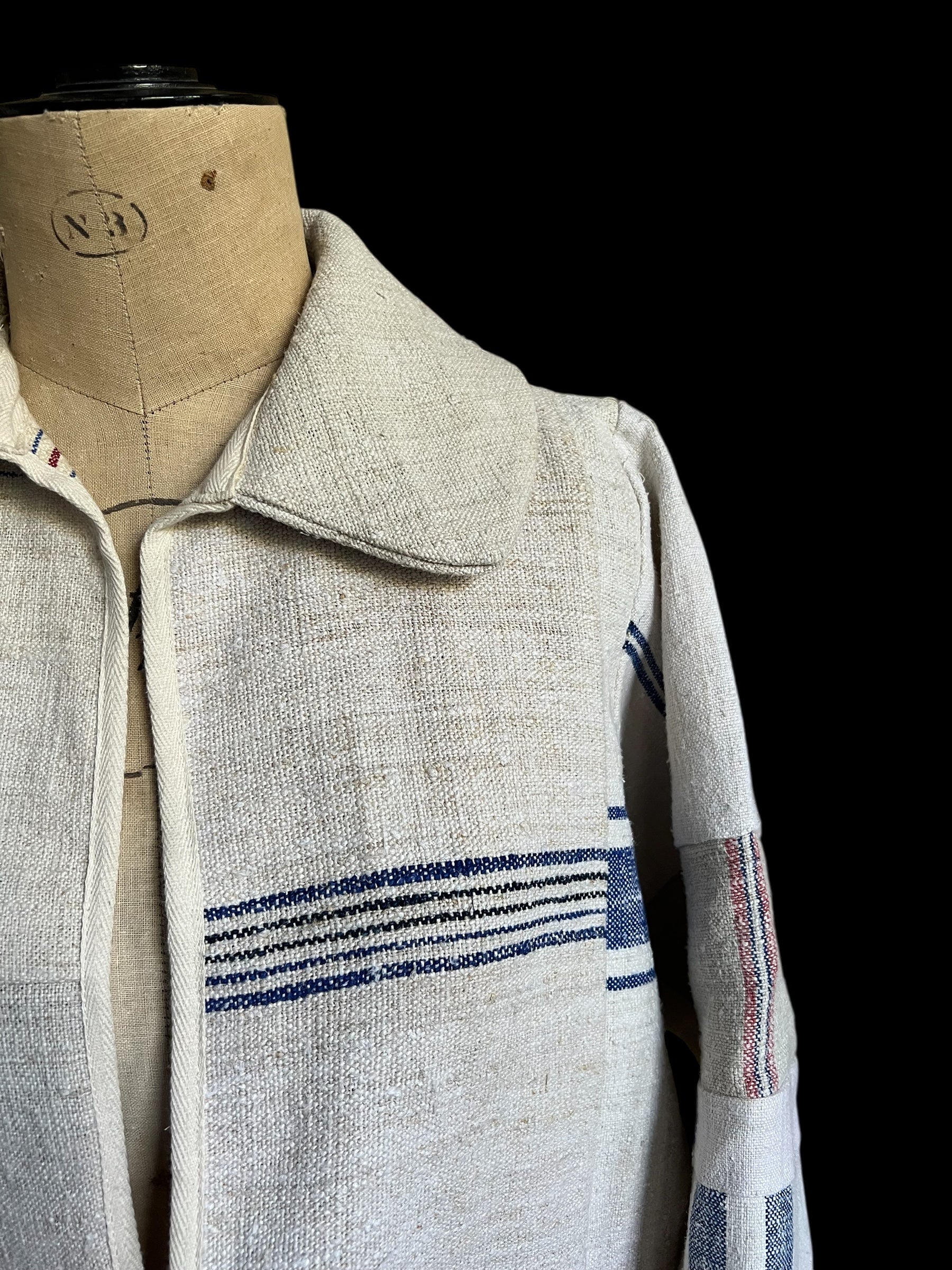 Here is a Duster Coat, made from a patchwork of pieces of Antique Linen Hungarian Grain sacks from my collections of textiles.